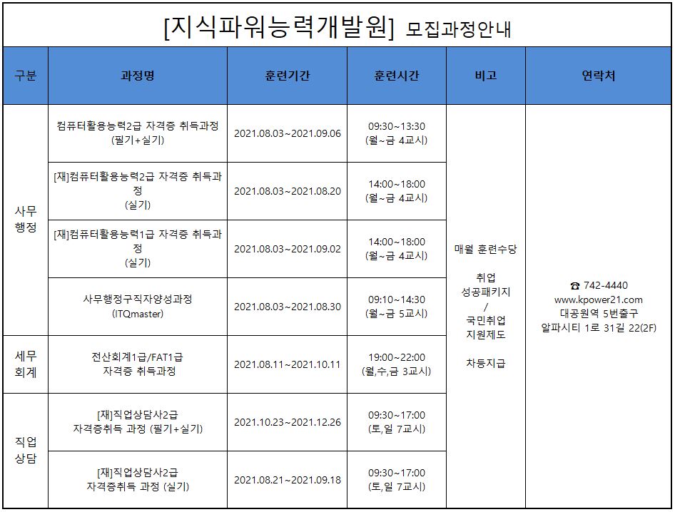 지식파워능력개발원 8월 개강일정입니다.