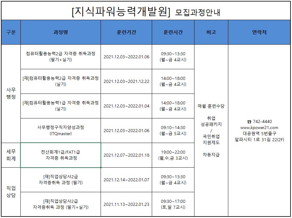 지식파워능력개발원 12월 개강일정입니다.