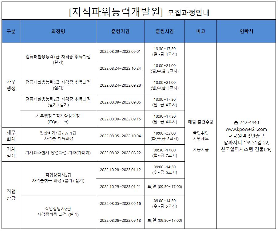 지식파워능력개발원 8월 개강일정입니다.