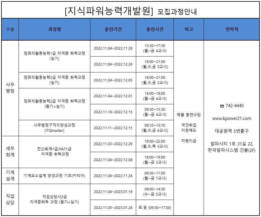 지식파워능력개발원 11월 개강일정입니다.
