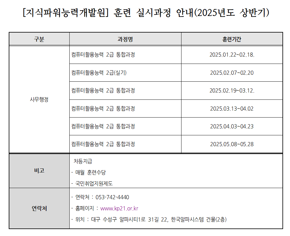 지식파워능력개발원 2025년 상반기 훈련실시 과정 안내 입니다.